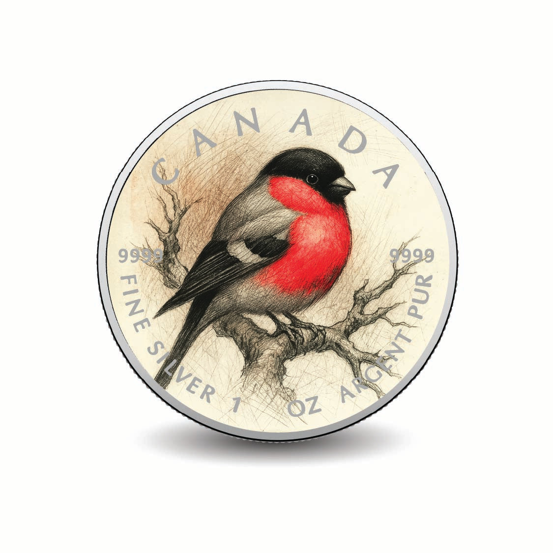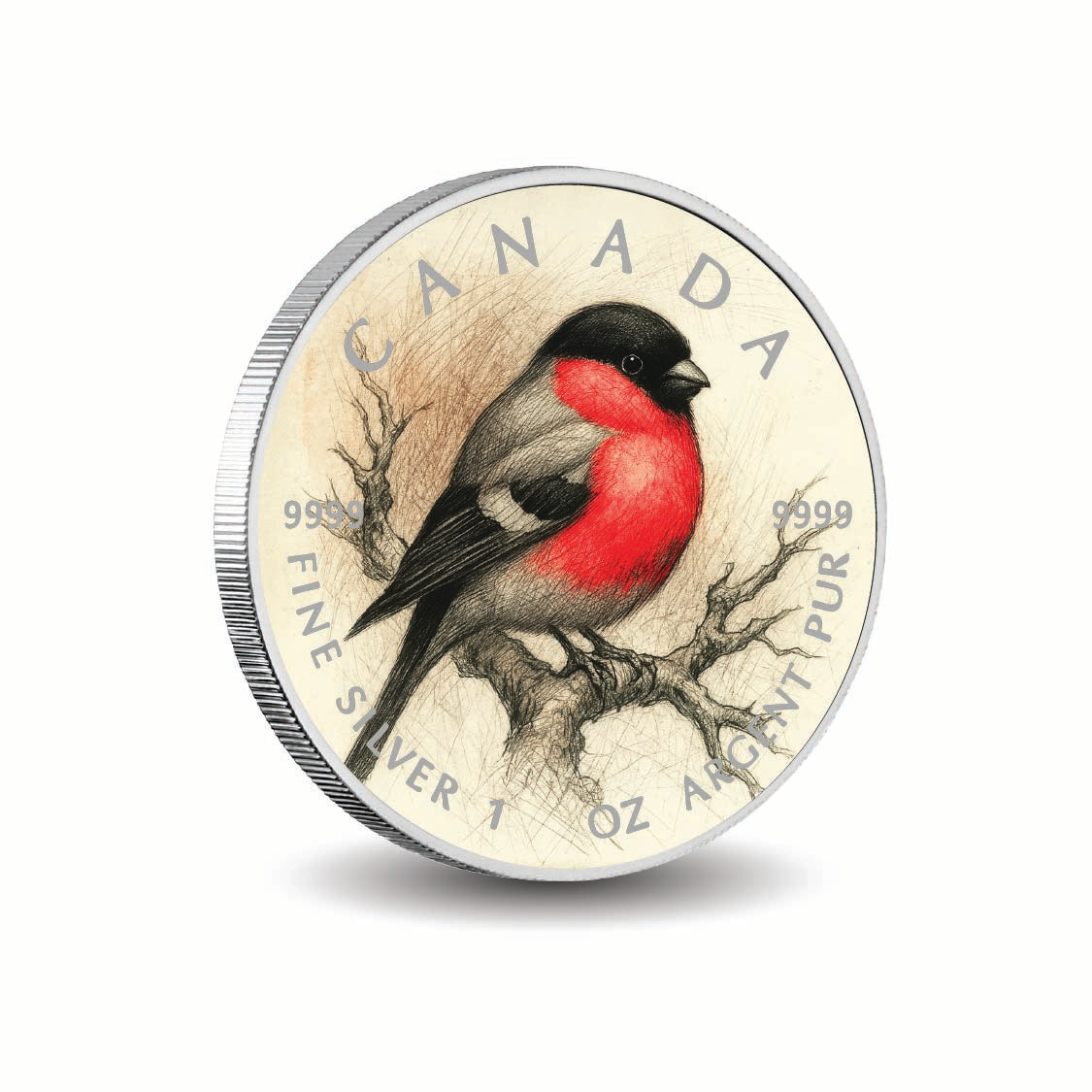 Experience the beauty of nature with the 2025 Canada 1oz 9999 Silver BU Flame in Winter’s Grip Colourized coin. This exquisite piece features a captivating depiction of a bullfinch, elegantly poised on a timeworn branch. The coin’s design highlights the bird’s striking crimson breast against the serene backdrop of detailed graphite textures, creating a stunning visual contrast that embodies the essence of winter's grace.