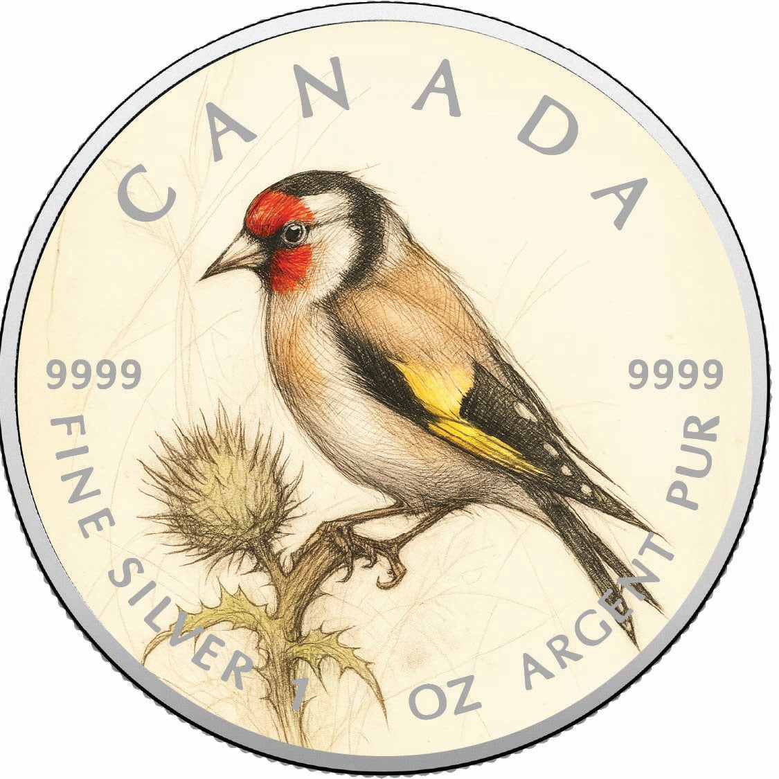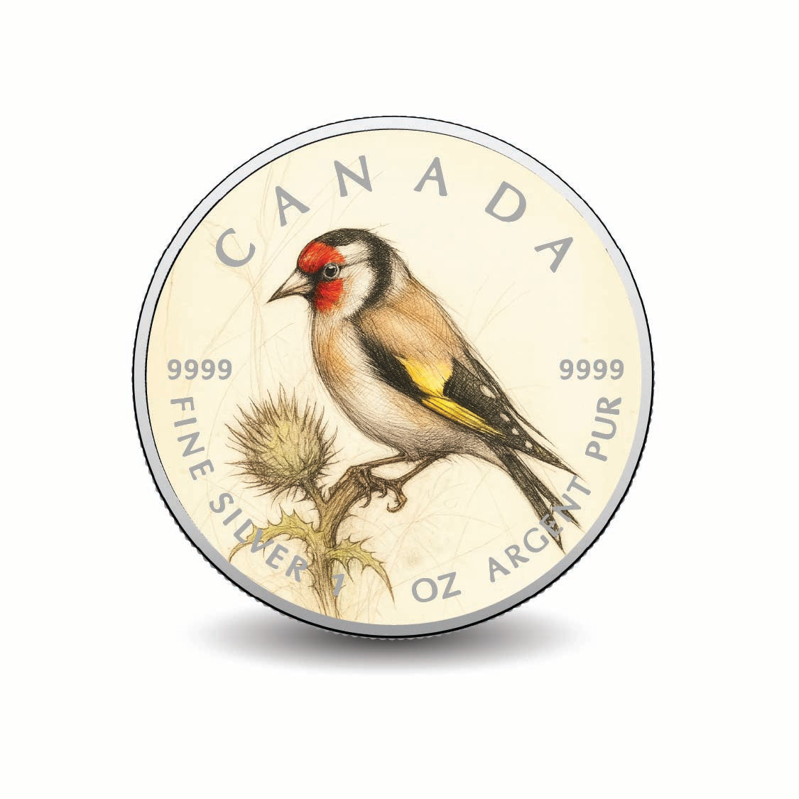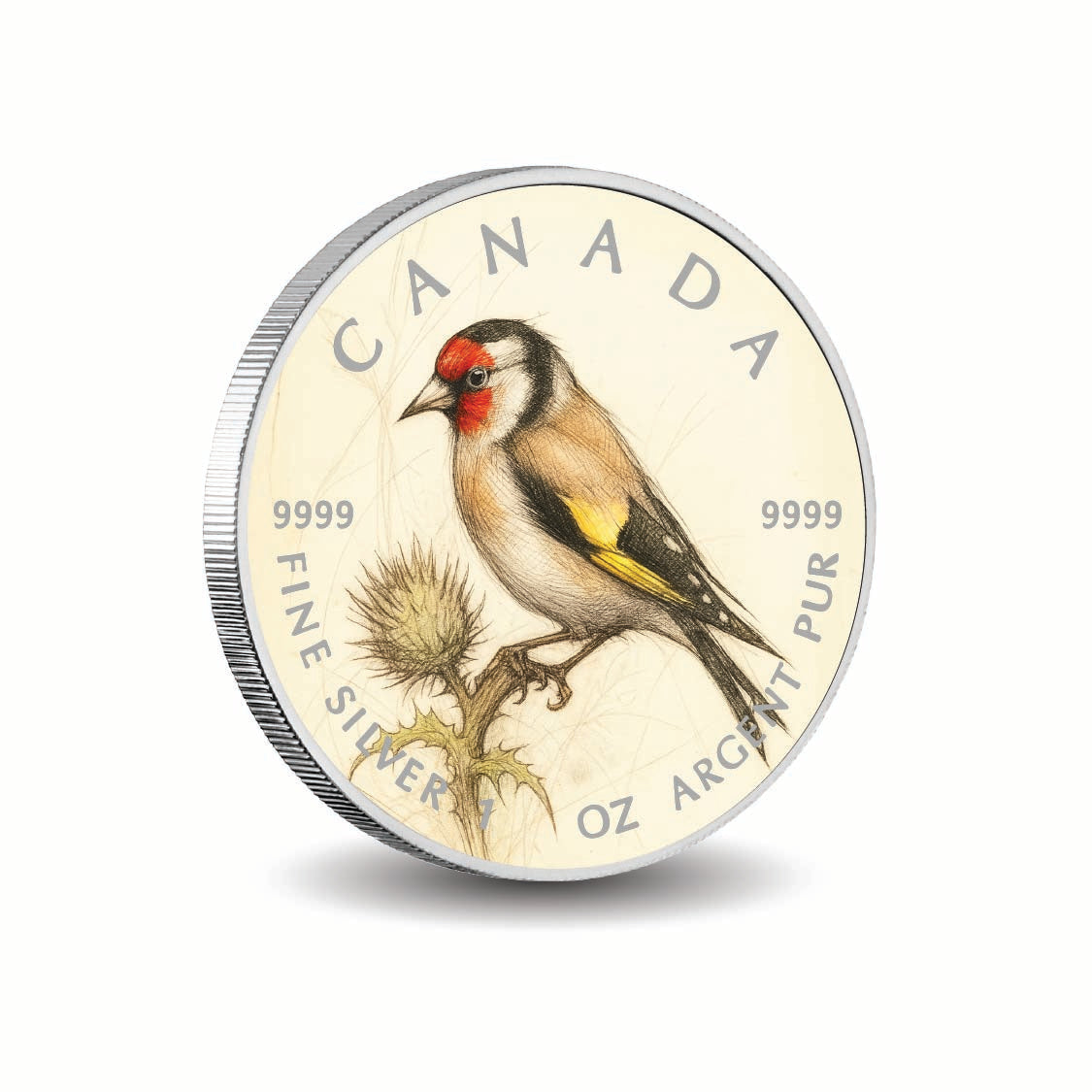 Discover the exquisite beauty of the 2025 Canada 1oz 9999 Silver BU The Thistle’s Guardian Colourized coin. This stunning piece features the elegant European goldfinch, gracefully perched on the spiny silhouette of a thistle. Its eye-catching red face and shimmering golden wing accents are brought to life through UV printing, set against a delicately shaded backdrop that highlights the intricate details of the thistle.