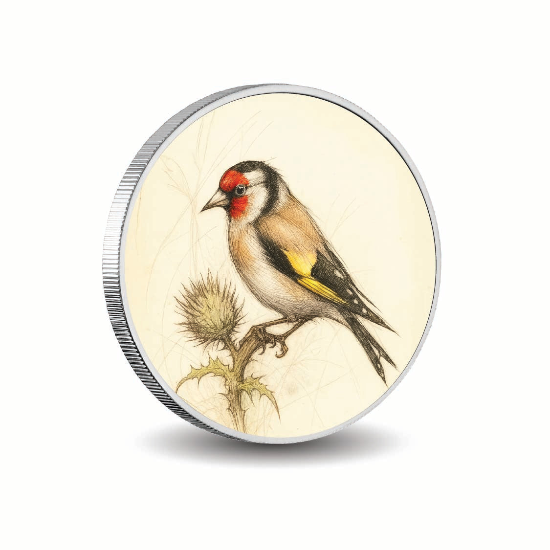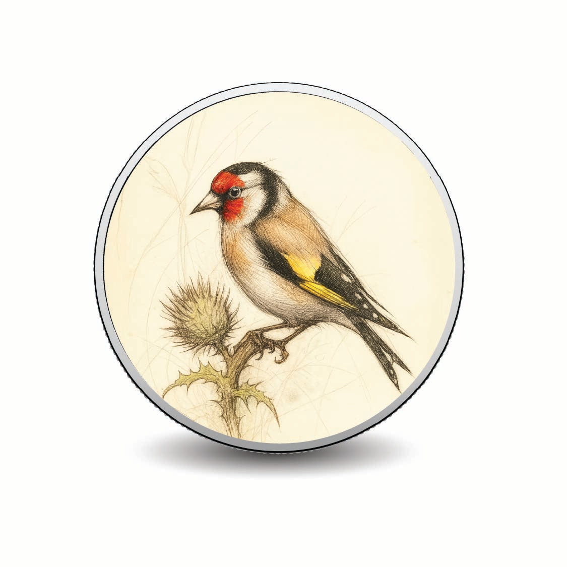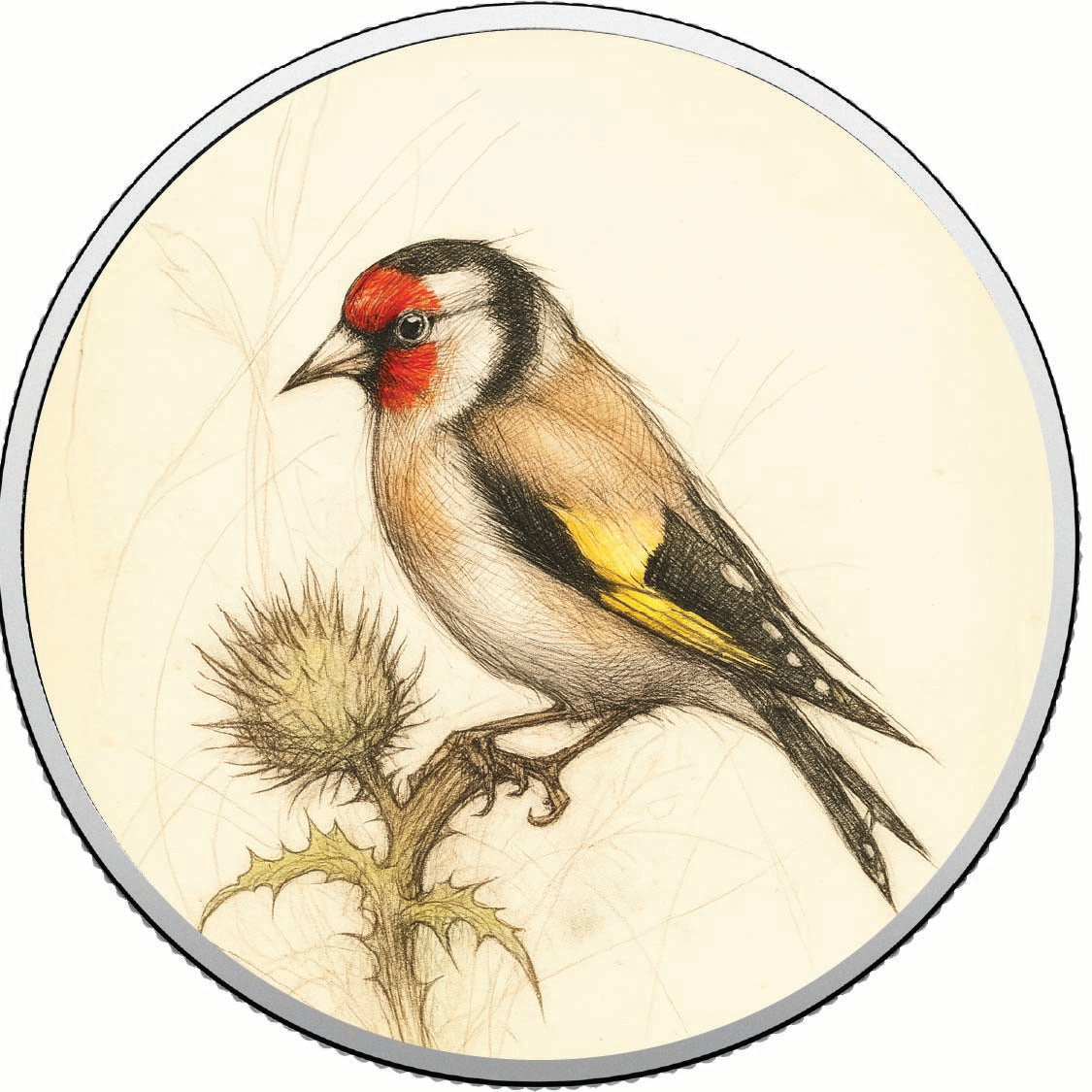 Introducing The Thistle’s Guardian 1oz Fine Silver Coloured Coin, a stunning addition to the acclaimed "The Poetry of Birds" series. This exquisite coin features a masterful depiction of the European goldfinch, delicately perched atop a thistle. The vibrant hues of the bird's red face and striking golden wing accents create an eye-catching contrast to the subtle pencil shading that enhances the visual appeal.