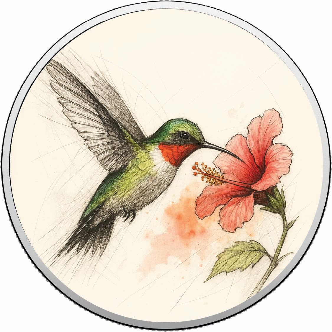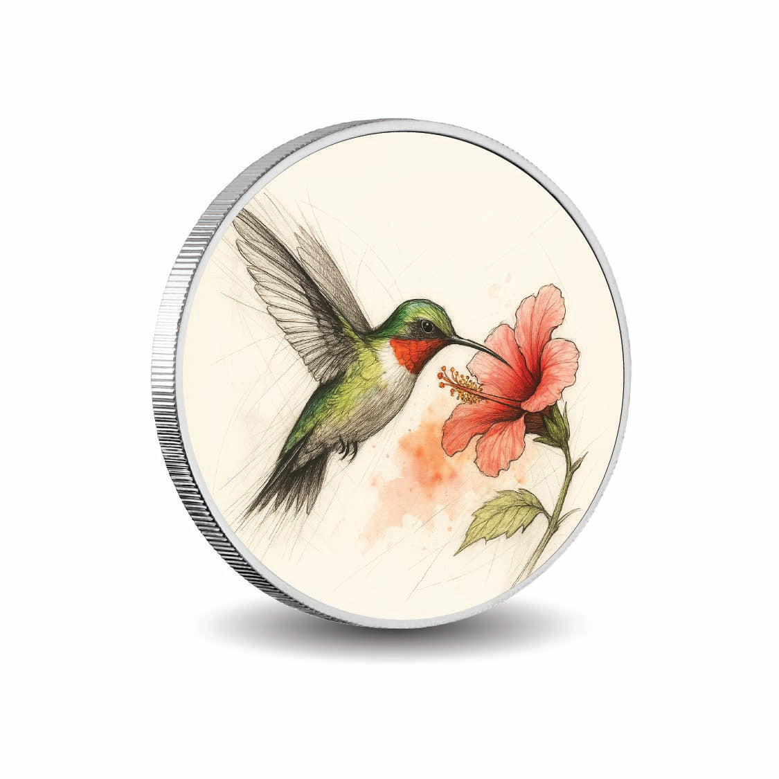 Introducing the Whispers of Nectar 1oz Fine Silver Coloured Coin, a stunning tribute to the exquisite beauty of nature encapsulated in precious metal. This coin features an intricately detailed representation of a ruby-throated hummingbird, elegantly captured in the act of sipping nectar from a vibrant hibiscus flower. The hummingbird's iridescent green plumage glimmers with life, while its striking scarlet throat serves as a brilliant contrast to the soft blush of the surrounding bloom.