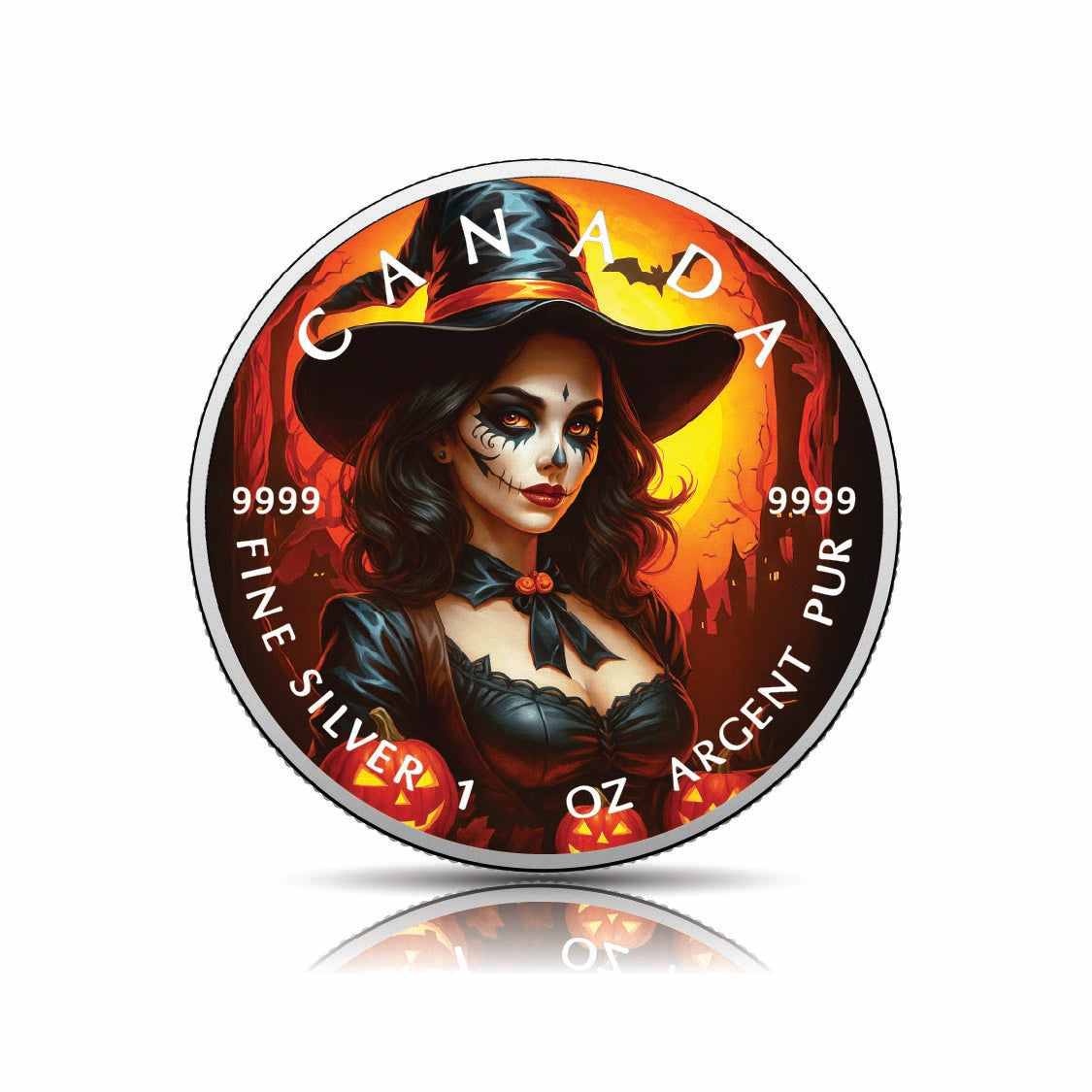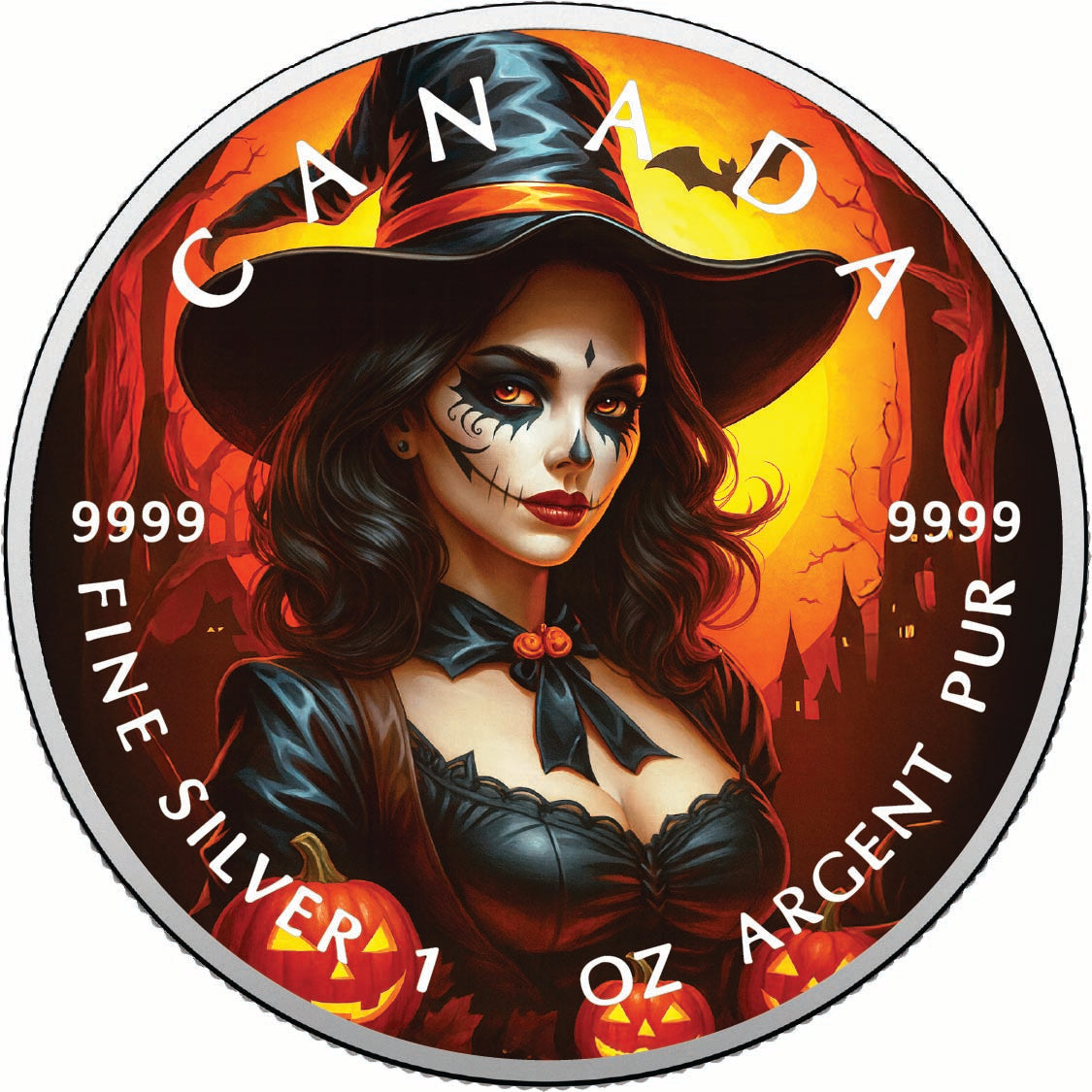 Experience the enchanting allure of the 2025 Canada 1oz 9999 Silver BU Bewitching Beauty Colourized coin. This exquisite piece features a captivating depiction of a witch standing gracefully beneath the ethereal glow of a harvest moon, surrounded by a trio of illuminated jack-o'-lanterns. Her striking features, accentuated with dark makeup and skeletal face paint, evoke a sense of mystery and magic.