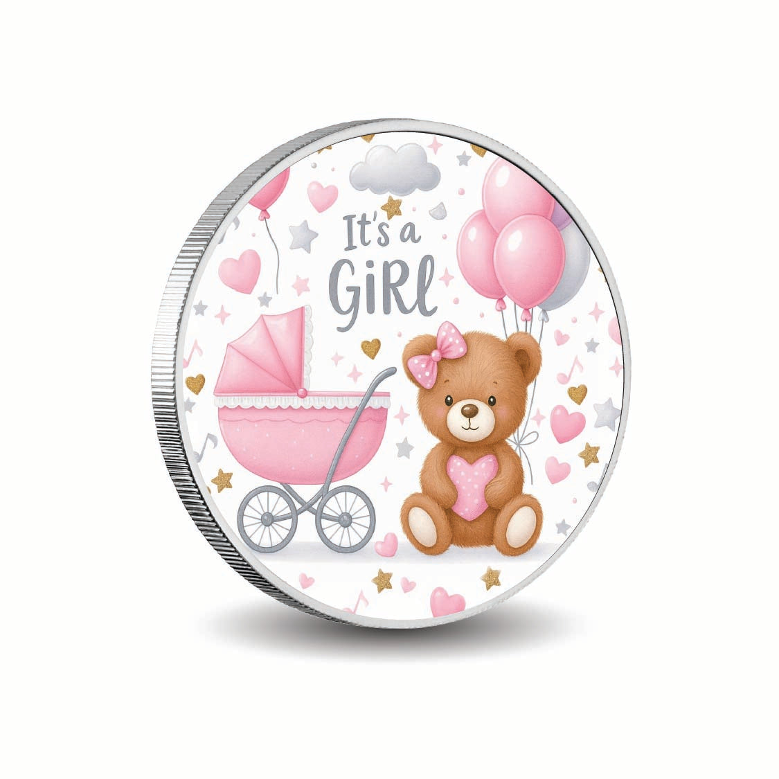 Celebrate the precious arrival of a baby girl with the Baby Joy Welcome Little Princess 1oz Silver Coloured Coin. This beautifully crafted coin features an enchanting illustration of a soft brown teddy bear holding a pink heart and adorned with a delightful pink bow, accompanied by a charming baby stroller. The whimsical design is enhanced by the playful inscription “It’s a Girl”, thoughtfully showcased above the scene.